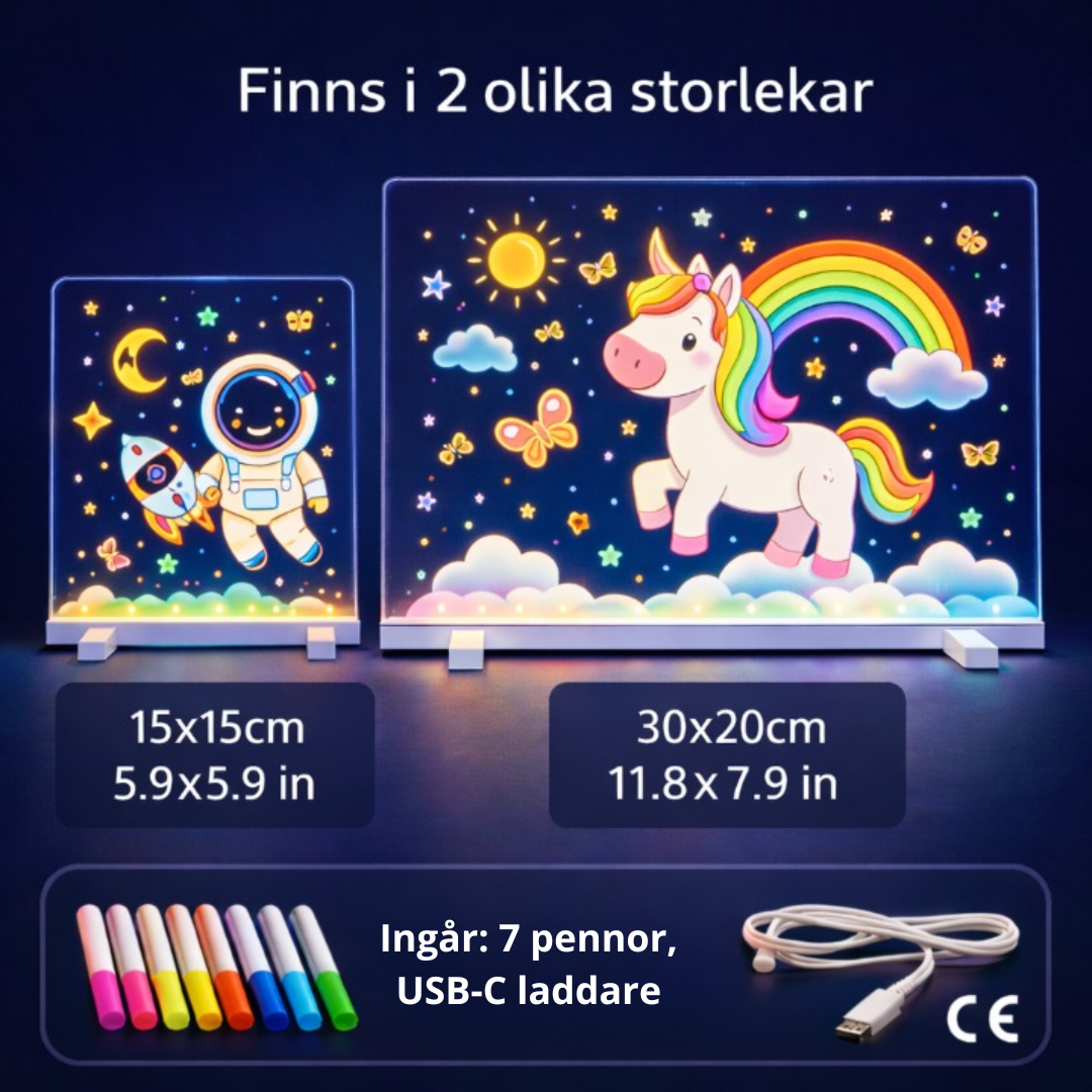 Linda M. FEB 2026Verifierad kund“Allt som utlovades ingick – och kvaliteten överraskade oss”Jag vill börja med att säga att allt som stod i beskrivningen faktiskt ingick. Tavlan, alla pennor och laddningskabeln låg med i förpackningen, och det kändes genomtänkt redan från start. Inget saknades och inget kändes billigt eller hastigt ihopplockat.Pennorna är verkligen bättre än jag förväntade mig. Färgerna blir starka direkt, de glider lätt över ytan och barnet behöver inte trycka hårt. Vi har använt tavlan regelbundet i flera veckor nu och pennorna fungerar fortfarande lika bra, utan att ha torkat eller tappat färg.Ljuset är en av de saker som imponerade mest. Det lyser jämnt och mjukt över hela tavlan och känns inte alls som en skärm. Det fungerar lika bra på dagen som på kvällen och blir aldrig för starkt eller bländande. På kvällen ger det mer en mysig glöd än ett skarpt ljus, vilket gör att barnet kan rita utan att bli uppvarvad.Helhetskänslan är att detta inte bara är en leksak, utan en genomtänkt produkt för vardagen. Enkel att använda, lätt att ladda och något som faktiskt används om och om igen. För oss känns det som ett köp som verkligen levde upp till förväntningarna.